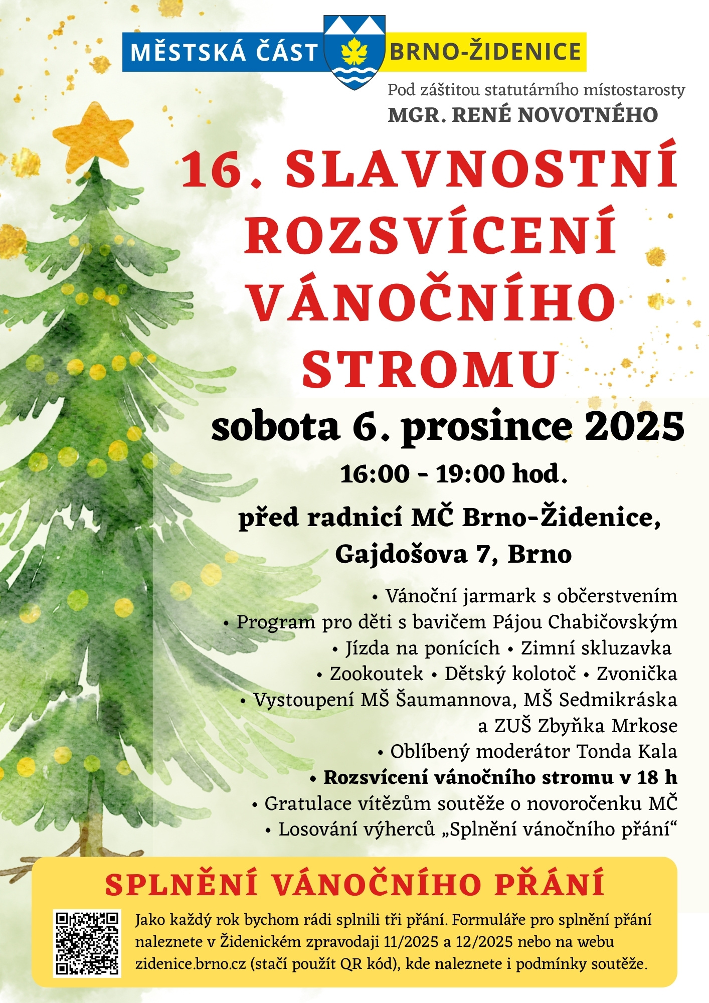 Při příležitosti 16. slavnostního rozsvícení vánočního stromu v naší městské části Brno-Židenice, bychom rádi provedli malé vánoční kouzlo a splnili tři přání – jedno dítěti, jedno dospělému a jedno seniorovi. Pro tento účel jsme vytvořili formuláře v Židenickém zpravodaji 11 a 12 / 2025, které prosím vyplňte a v den akce (tj. 6.12.2025) vhoďte přítomnému andílkovi do kouzelné vánoční schránky. Losování proběhne po rozsvícení stromečku v 18 hod. Formulář si můžete také vytisknout z PDF nebo JPG uveřejněných zde a ke stažení níže. Maximální cena vítězného dárku 2.000,- Kč.