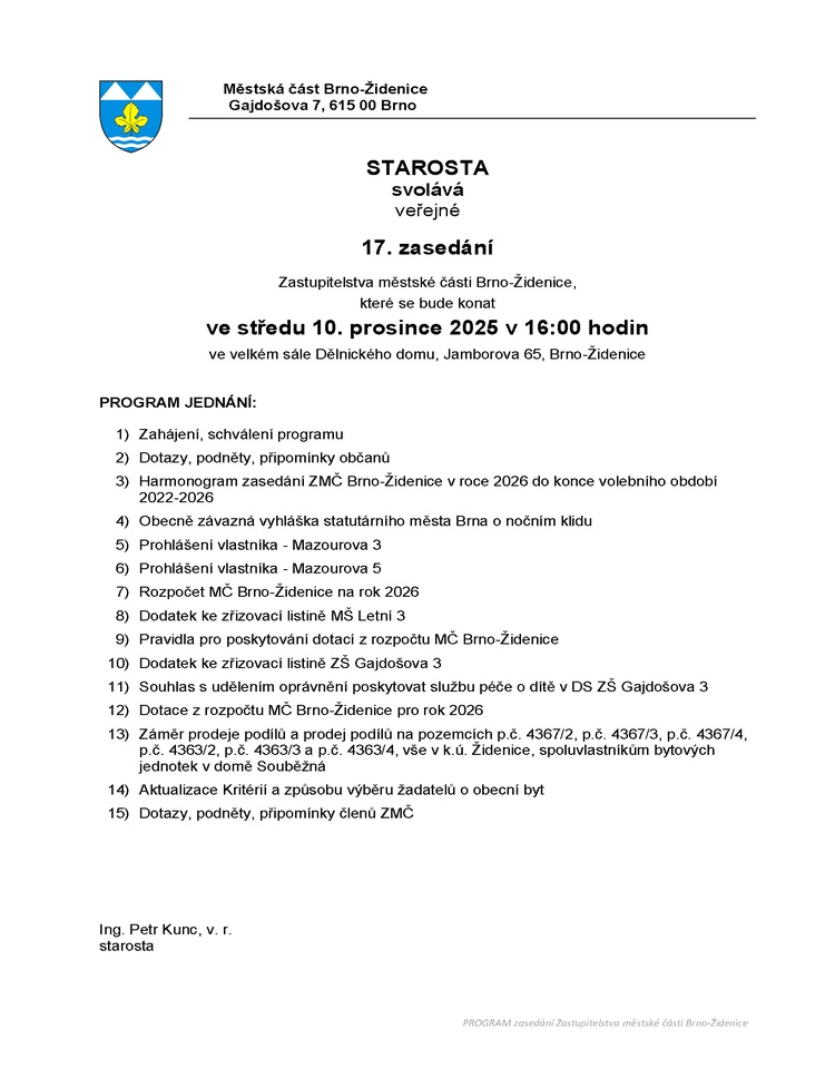 17. veřejné zasedání Zastupitelstva městské části Brno-Židenice se bude konat ve středu 10. 12. 2025 v 16:00 hodin ve velkém sále Dělnického domu, Jamborova 65, Brno-Židenice.