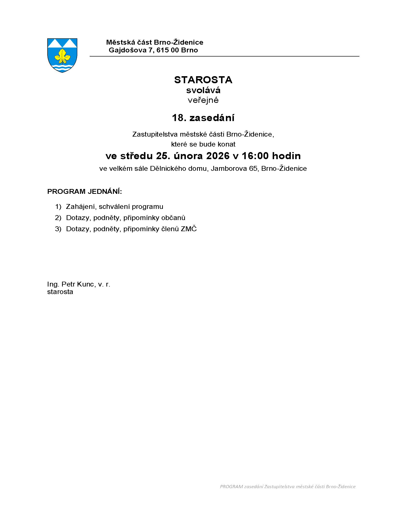 18. veřejné zasedání Zastupitelstva městské části Brno-Židenice se bude konat ve středu 25. 2. 2026 v 16:00 hodin ve velkém sále Dělnického domu, Jamborova 65, Brno-Židenice.