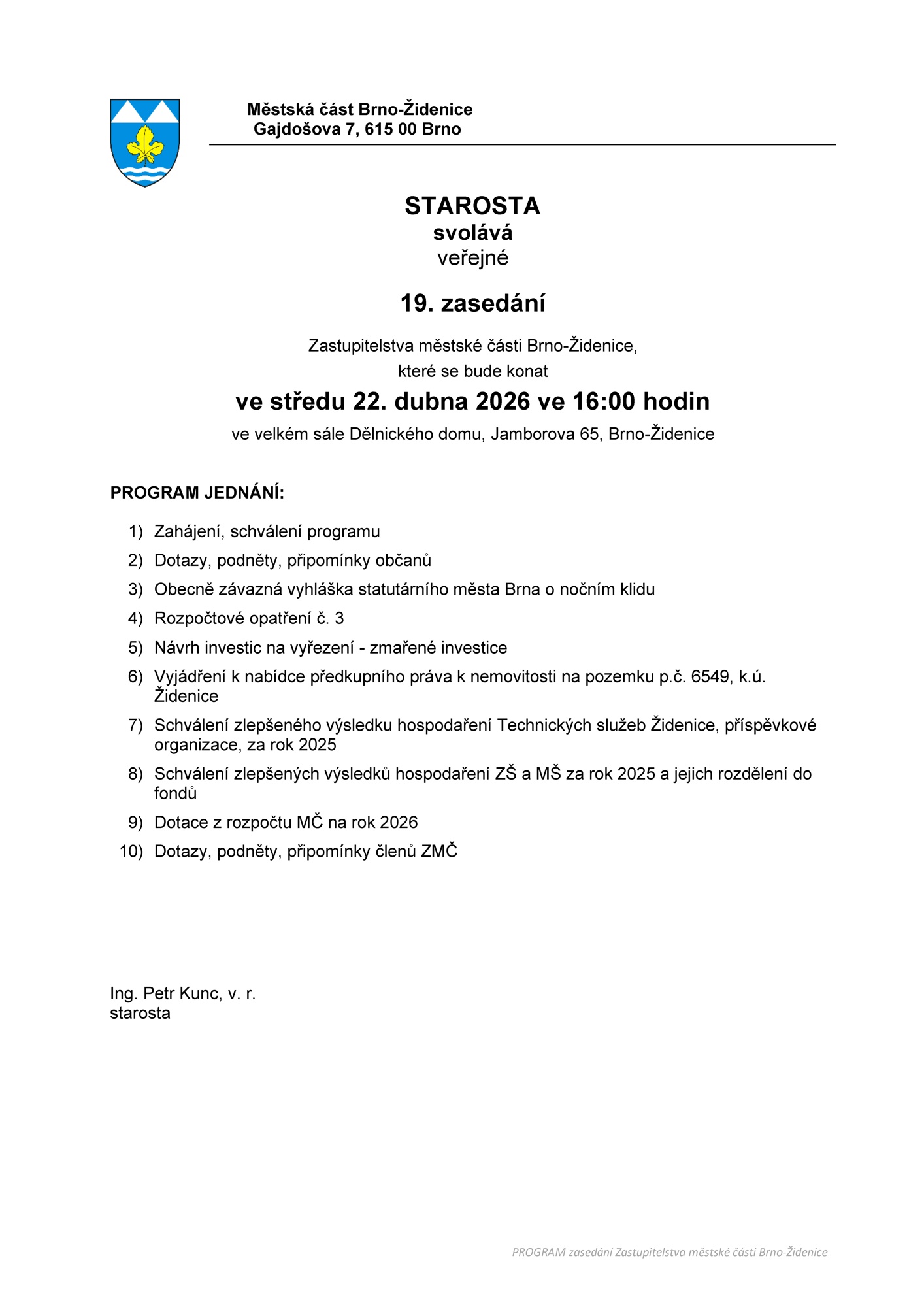 19. veřejné zasedání Zastupitelstva městské části Brno-Židenice se bude konat ve středu 22. dubna 2026 v 16:00 hodin ve velkém sále Dělnického domu, Jamborova 65, Brno-Židenice.