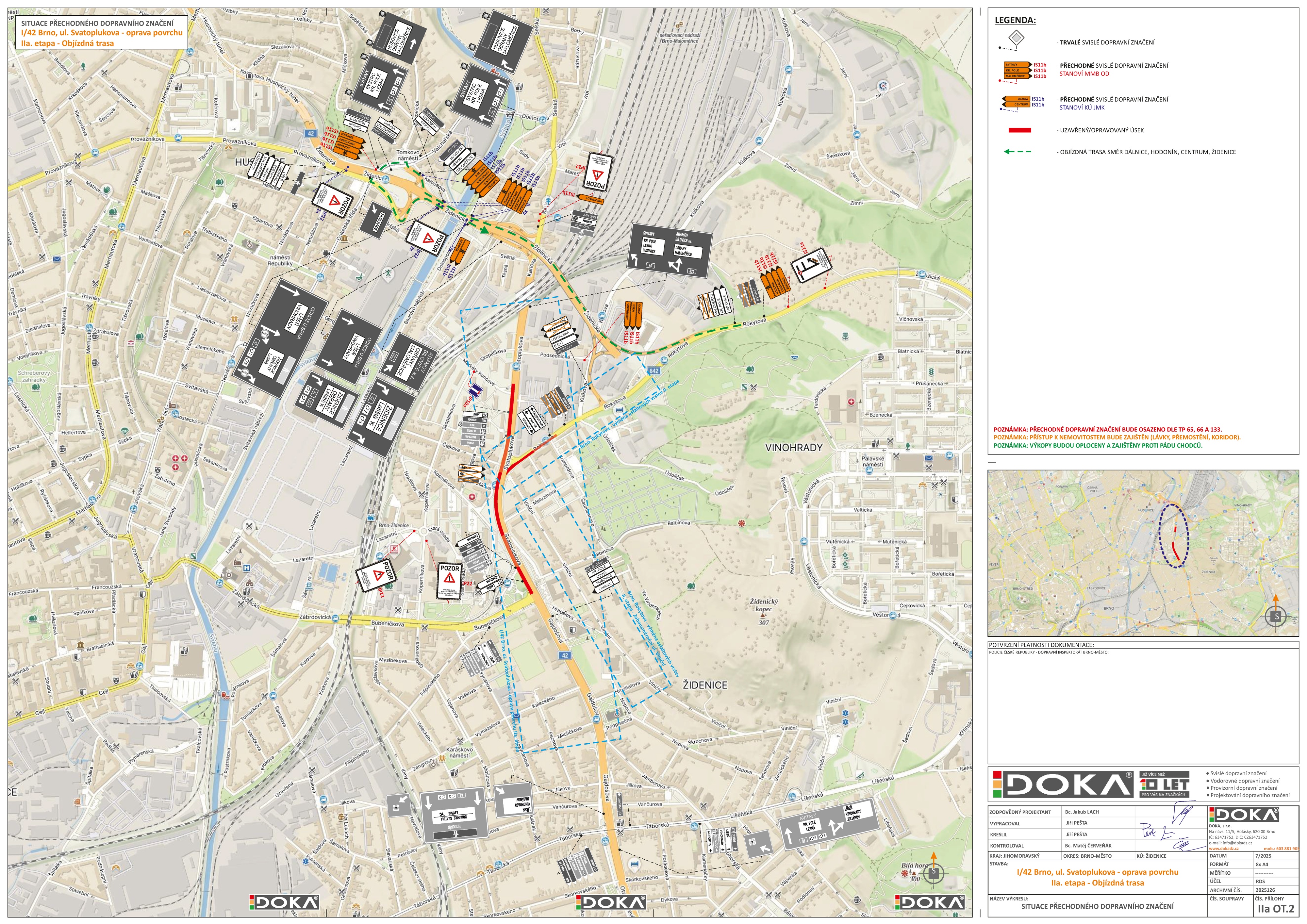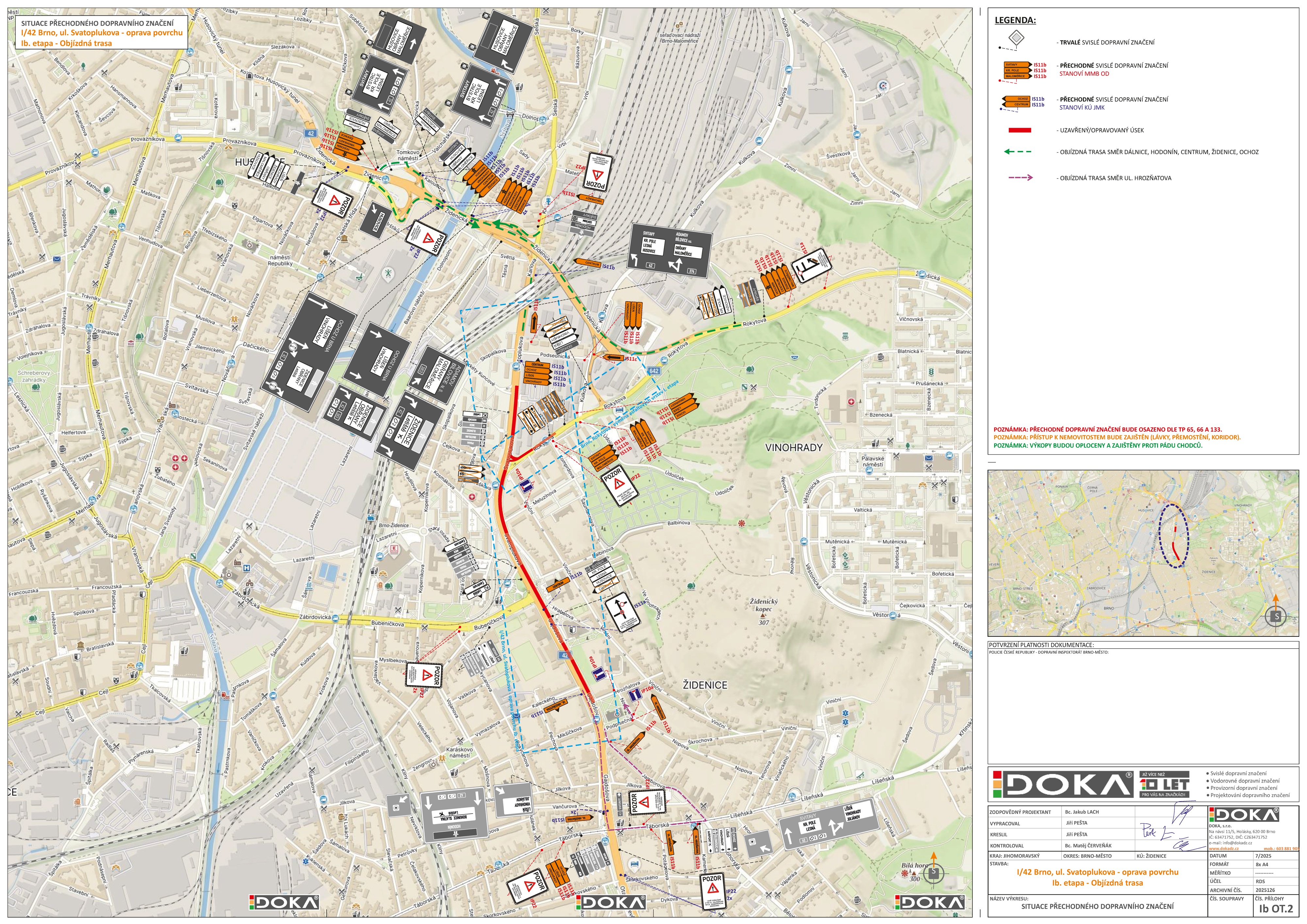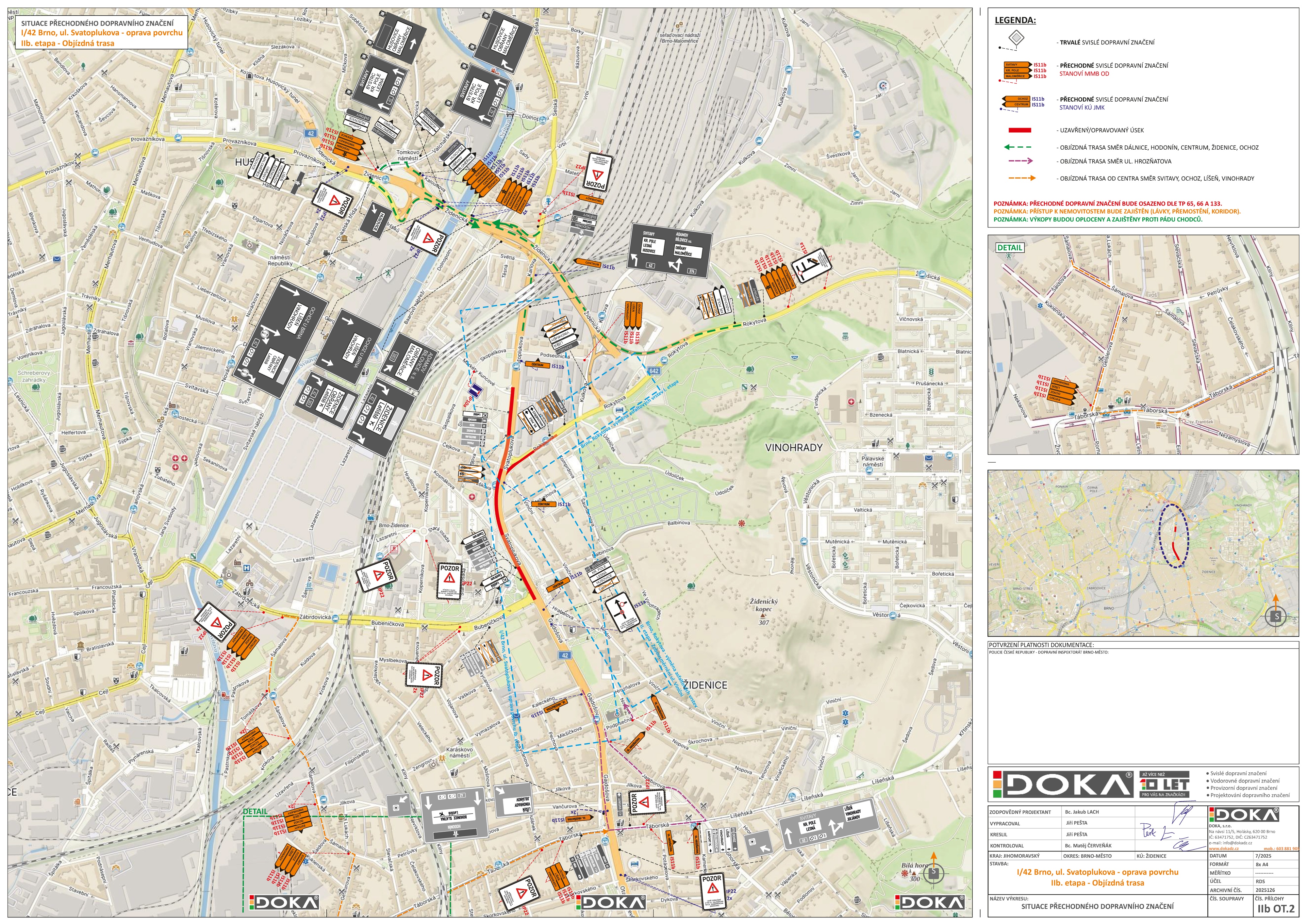 - objízdná trasa z II/642 směr dálnice, Hodonín, Centrum, Židenice vedena po I/42 VMO Rokytova, Židenická, přes rampu Kaloudova, Tomkovo nám., rampu Nová Dukelská zpět na I/42 Židenická, poté dle TDZ