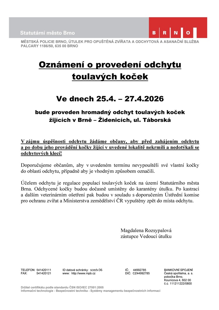 Oznámení o provedení odchytu toulavých koček ve dnech 25.4. – 27.4.2026, kdy bude proveden hromadný odchyt toulavých koček žijících v Brně – Židenicích, ul. Táborská.