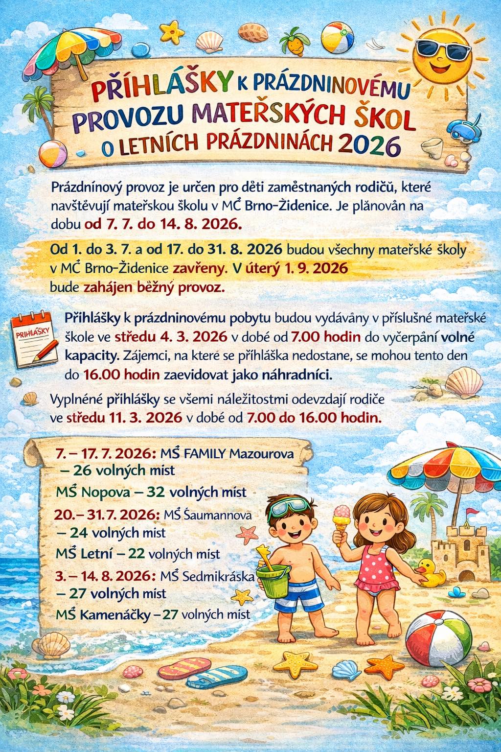 Prázdninový provoz je určen pro děti zaměstnaných rodičů, které navštěvují mateřskou školu v MČ Brno-Židenice. Je plánován na dobu od 7. 7. do 14. 8. 2026.