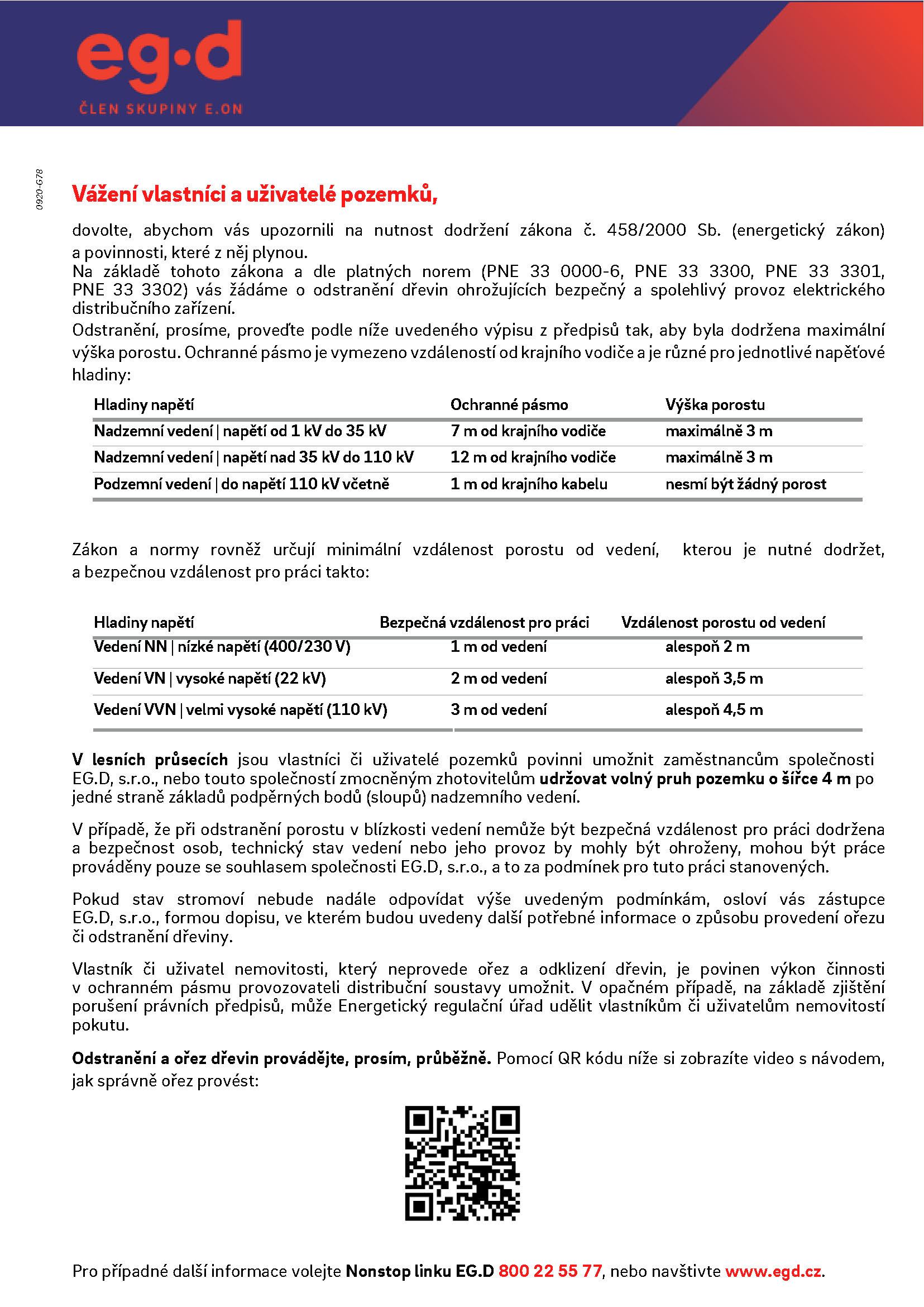 V lesních průsecích jsou vlastníci či uživatelé pozemků povinni umožnit zaměstnancům společnosti EG.D, s.r.o., nebo touto společností zmocněným zhotovitelům udržovat volný pruh pozemku o šířce 4 m po jedné straně základů podpěrných bodů (sloupů) nadzemního vedení.