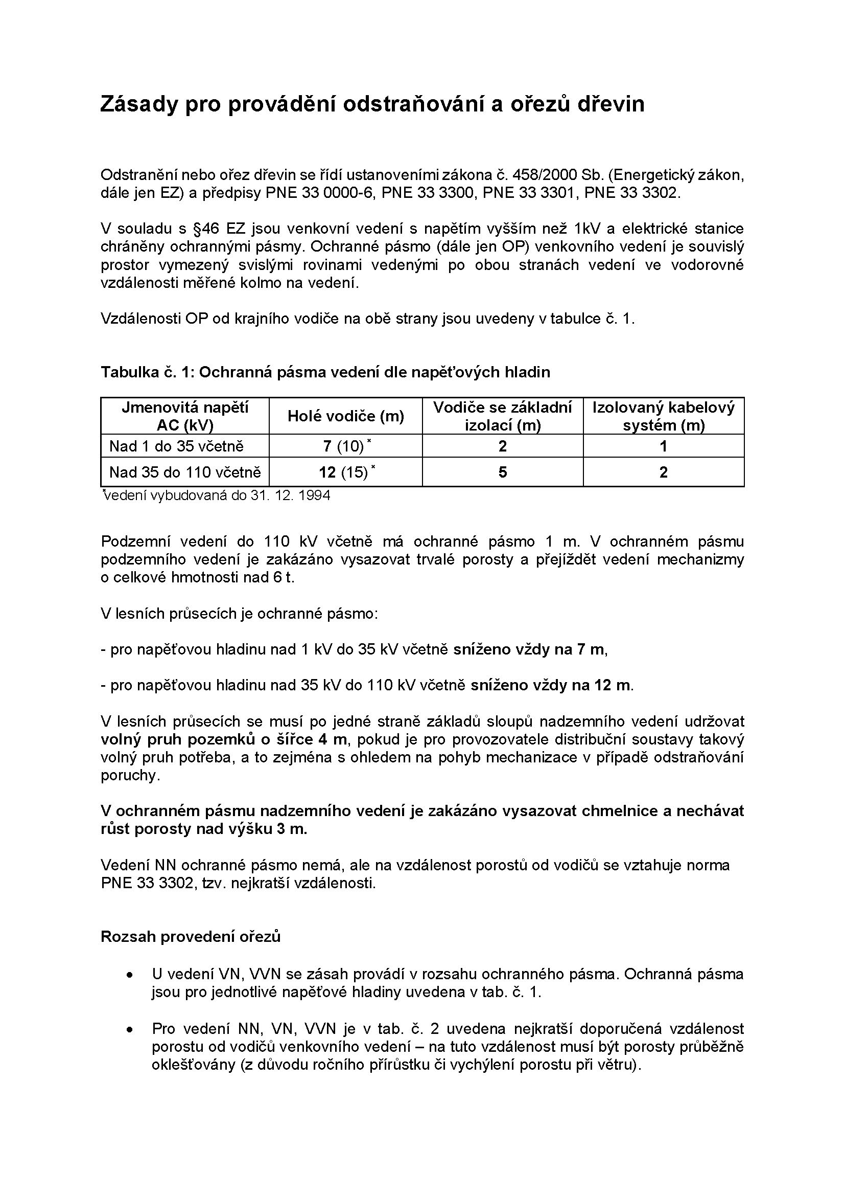 Odstranění, prosíme, proveďte podle níže uvedeného výpisu z předpisů tak, aby byla dodržena maximální výška porostu. Ochranné pásmo je vymezeno vzdáleností od krajního vodiče a je různé pro jednotlivé napěťové hladiny:
