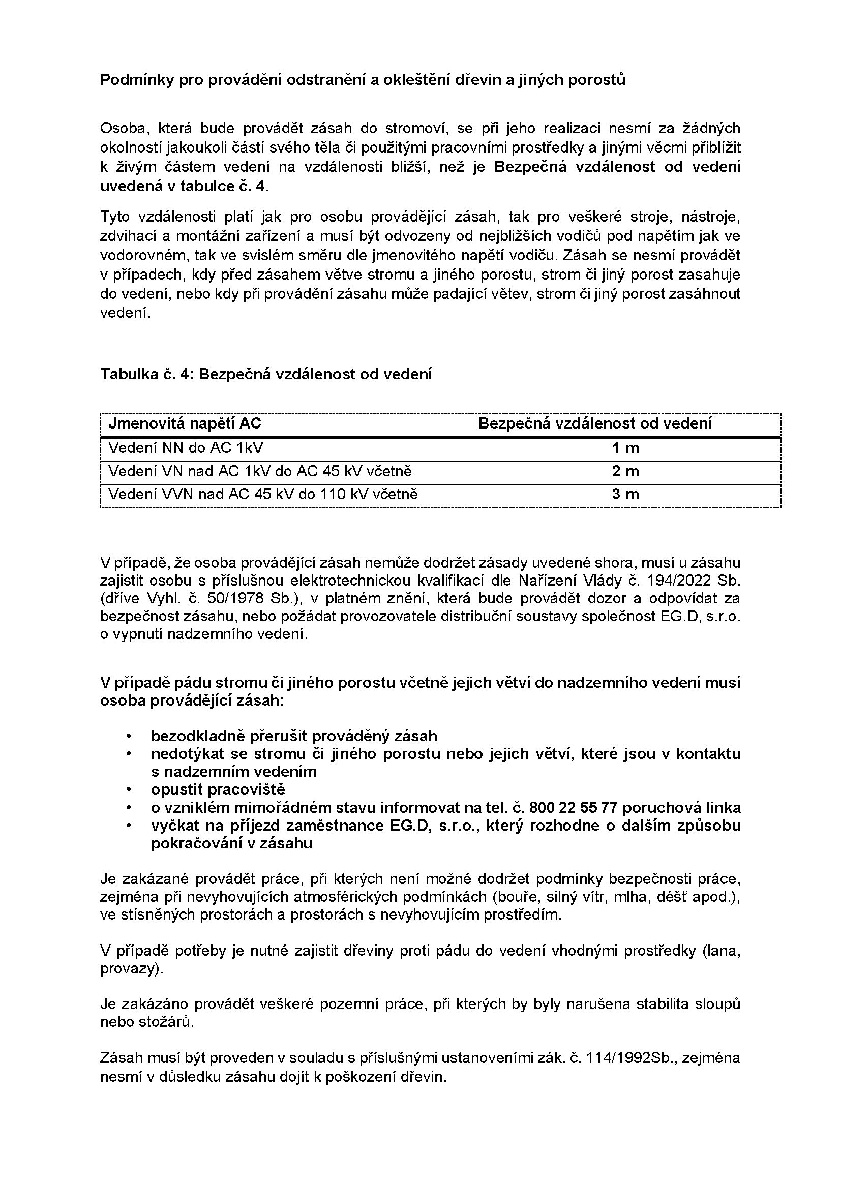 V případě, že při odstranění porostu v blízkosti vedení nemůže být bezpečná vzdálenost pro práci dodržena a bezpečnost osob, technický stav vedení nebo jeho provoz by mohly být ohroženy, mohou být práce prováděny pouze se souhlasem společnosti EG.D, s.r.o., a to za podmínek pro tuto práci stanovených.